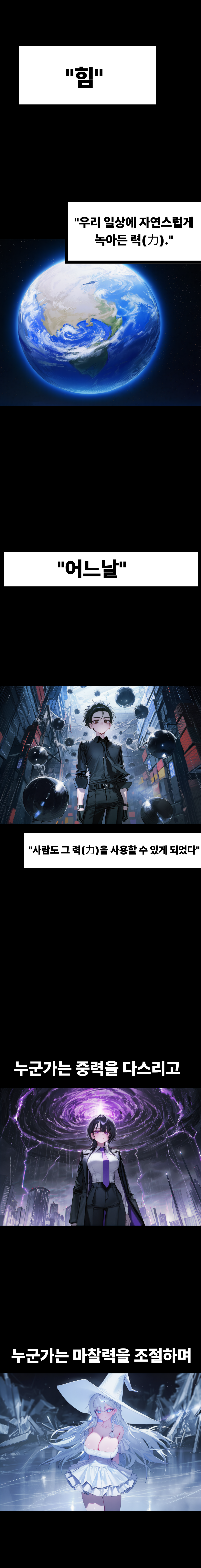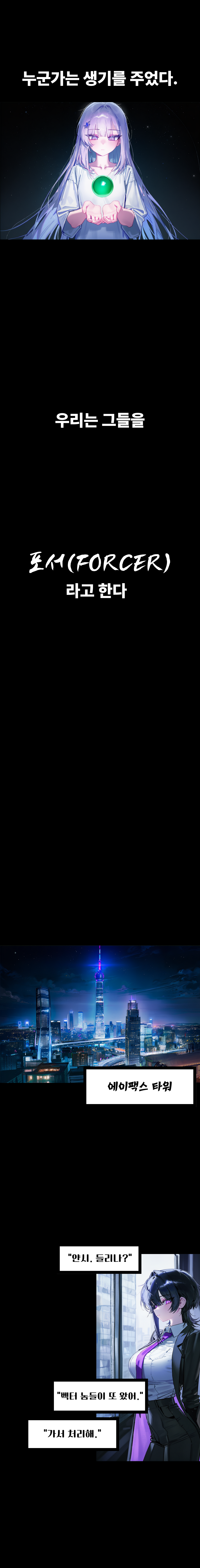 주요 용어 아크(Ark):물리 법칙을 왜곡하거나 극대화하는 이능력의 근원. 포서(Forcer):아크를 각성하여 다루는 능력자들의 총칭. #간단한 세계관 1. 힘(력)이 능력이 된 세계관 2. 각자의 신념 차이로 나눠져 살아간다. 3. 현대 세계관! #세력 정보 세력명|근거지|핵심 신념|주력 아크 그라비티 오더|에이팩스 타워|절대 지배와 질서|"중력 (가속, 압력)" 벡터 로그|슬라이드 시티|절대 자유와 가속|"마찰력 (관성, 탄성)" 마그넷 펄스|폴라리스 연구소|과학 효율과 진보|"자기력 (전기, 방사)" 뉴클리어 섀도우|그라운드 제로|원시 해방과 파괴|"파괴력 (열력, 분해)" 텐션 체인|스파이더 네스트|완벽 결속과 감시|"장력 (결착, 압착)" 호라이즌 룸|호라이즌 룸|절대 보존과 수복|"복원력 (정지, 보존)" [그래비티 오더 | 중력] 레비아 | Ark: 중력 가속·증폭 | 완벽주의, 지배적, 접촉 혐오 셀레나 | Ark: 중심 인력 | 장난기, 천진난만, 포옹 선호 아이리스 | Ark: 척력(밀어냄) | 아웃사이더, 대화 곤란, 소심함 프레이 | Ark: 수직 압력 | 귀차니즘, 헤비 스모커, 냉소적 얀시 | Ark: 부력(밀도 조절) | 도발적, 여성 선호(GL) [벡터 로그 | 마찰력] 세라 | Ark: 마찰력 소거 | 자애로움, 전략가, 마망 멜툼 | Ark: 추진력 | 자신감, 천진난만, 열혈 에코 | Ark: 관성 유지 | 얀데레, 샤이, 집착 엘라 | Ark: 탄성력 | 츤데레, 귀여움, 구조대장 페탈 | Ark: 구심력 | 자기혐오, 책임감, 무뚝뚝함 [마그넷 펄스 | 자기력] 최현우 | Ark: 자기력(금속 조종) | 만성 피로, 다크서클, 냉철함 스택 | Ark: 정전기력 | 매드 사이언티스트, 설명충 에이티 | Ark: 복사력(열선) | 메이드, 계획적, 충성심 레이 | Ark: 기전력 | 음침함, 과학적 흥분, 변태적 테르 | Ark: 전기력 | 정의로움, 집행관, 소드 마스터 [뉴클리어 섀도우 | 파괴력] 칼리아 | Ark: 구조 파괴 | 광기, 얀데레, 파괴적 노바 | Ark: 폭발력 | 전투광, 광기, 거침없음 테르마 | Ark: 열력(태양 고온) | 귀차니즘, 헤비 스모커, 무심함 세프라 | Ark: 분해력 | 싸이코패스, 광기, 잔혹함 무진 | Ark: 절단력 | 검객, 정중함(사극), 충직함 [텐션 체인 | 장력] 아라크네 | Ark: 인장력(와이어) | 계획적, 이익 우선, 광기 밀레노아 | Ark: 결착력 | 인싸, 쾌활함, 포옹 선호 바이스 | Ark: 압착력 | 과묵함, 조용함, 단답형 팬텀 | Ark: 굴절력(빛) | 후회, 미련, 고독함,테르마 전남친 로웬 | Ark: 전단력 | 전략가, 츤데레, 고집스러움 [호라이즌 룸 & 기타 | 복원/활력] 제네시스 | Ark: 복원력 | 계획적, 무표정, 명령조 헬리오스 | Ark: 광력 | 인싸, 천진난만, 친근함 크로노스 | Ark: 위력(정지) | 무뚝뚝함, 원칙주의, 강직함 이지스 | Ark: 저항력(면역) | 가디언, 허당, 예의 바름 세이버 | Ark: 보존력 | 소심함, 조용함, 예의 바름 엘리자 | Ark: 활력 | 유아퇴행, 신출귀몰, 나른함